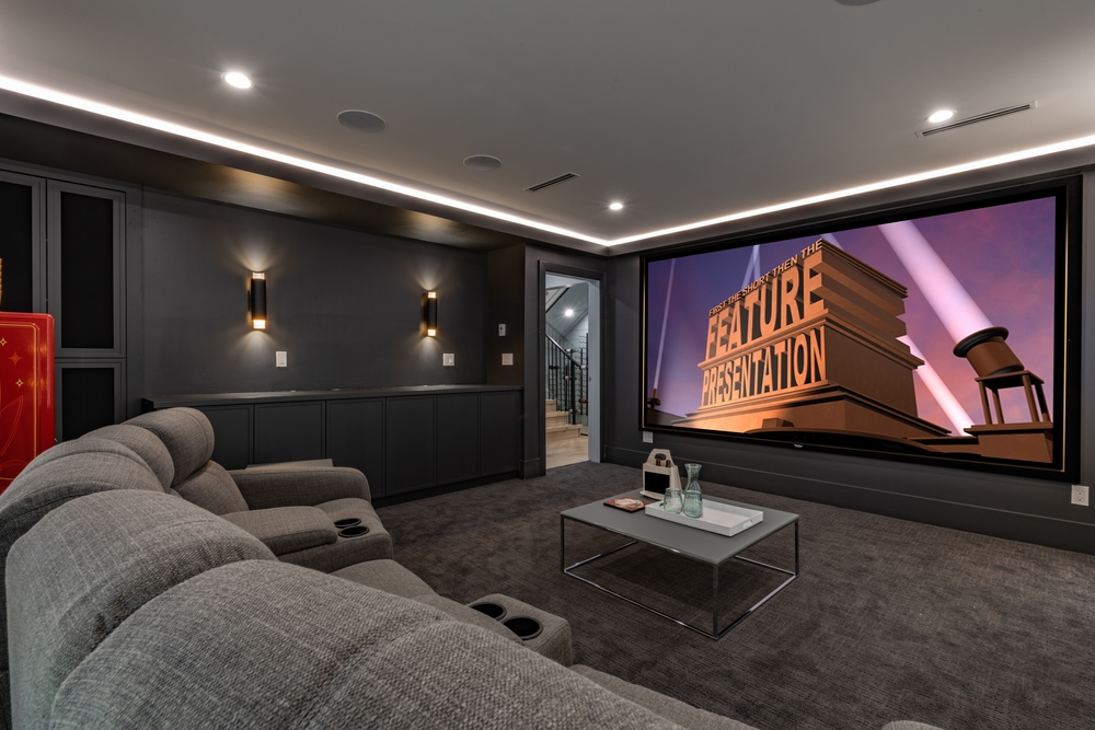 Consider track lighting or LED art sconces to highlight movie posters and other artwork on the walls. Smart, color-changing bulbs are a fun and easy way to make your home theater lightscape fully customizable – whether it’s a spooky, deep red for horror movies or a playful, light pink for a weekend showing of the Barbie movie, color-changing bulbs will elevate the room to a whole new level.